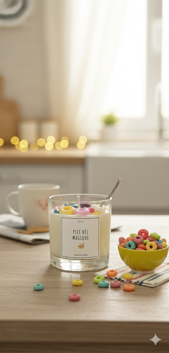 Une bougie ludique et joyeuse, inspirée des matins d’enfance — du lait crémeux surmonté de céréales colorées. Fabriquée avec de la cire de soja naturelle, non toxique et sûre, elle apporte une touche douce et nostalgique à votre intérieur.